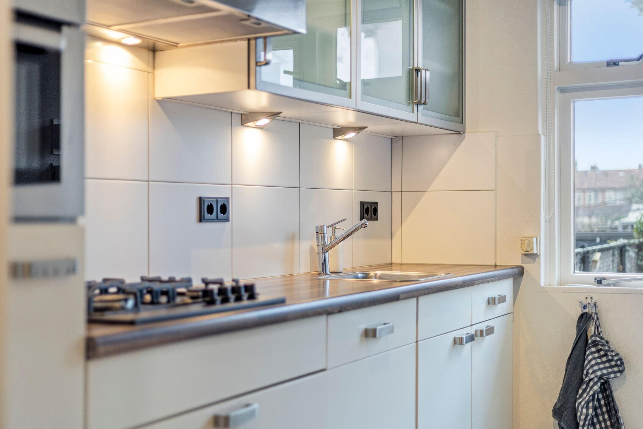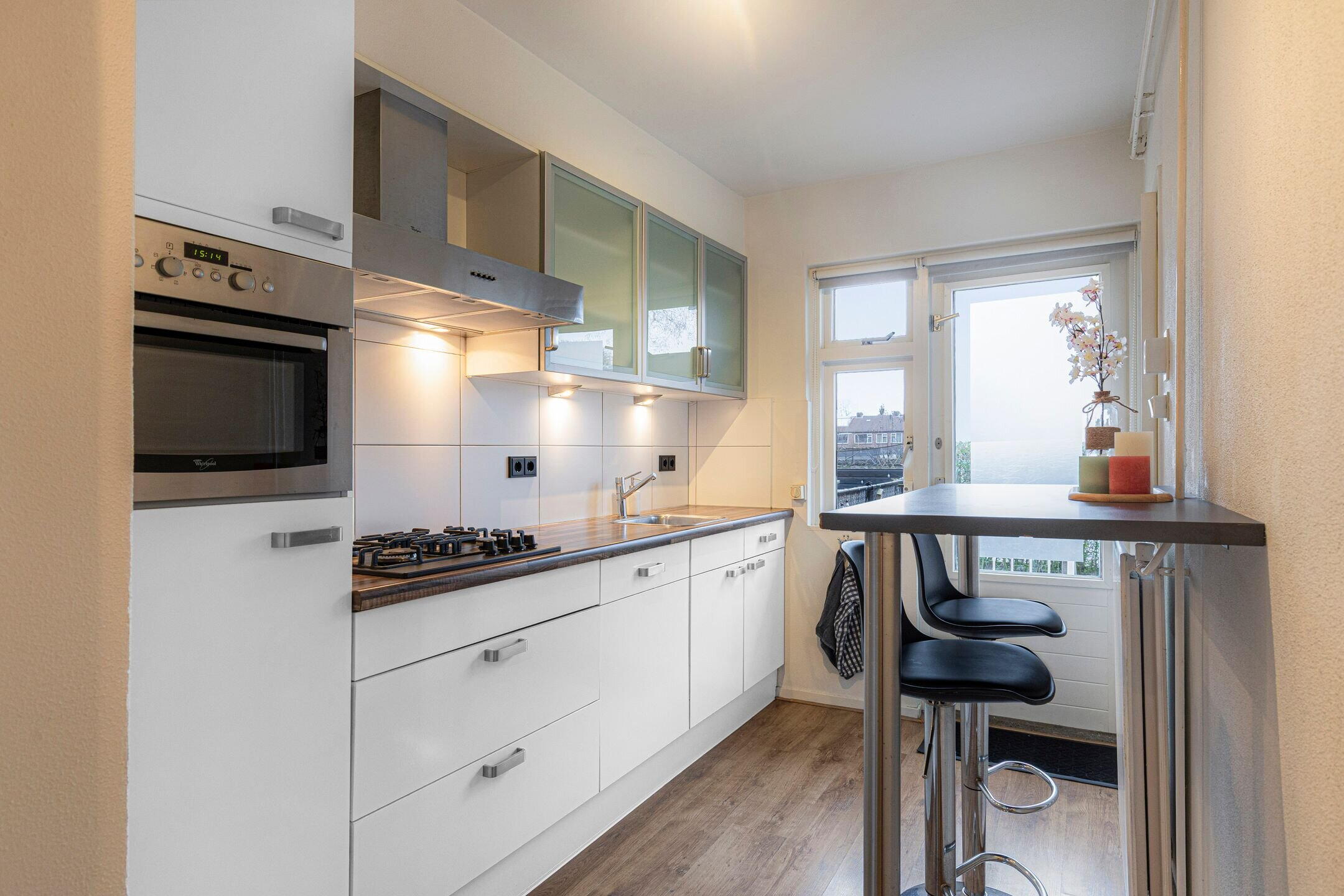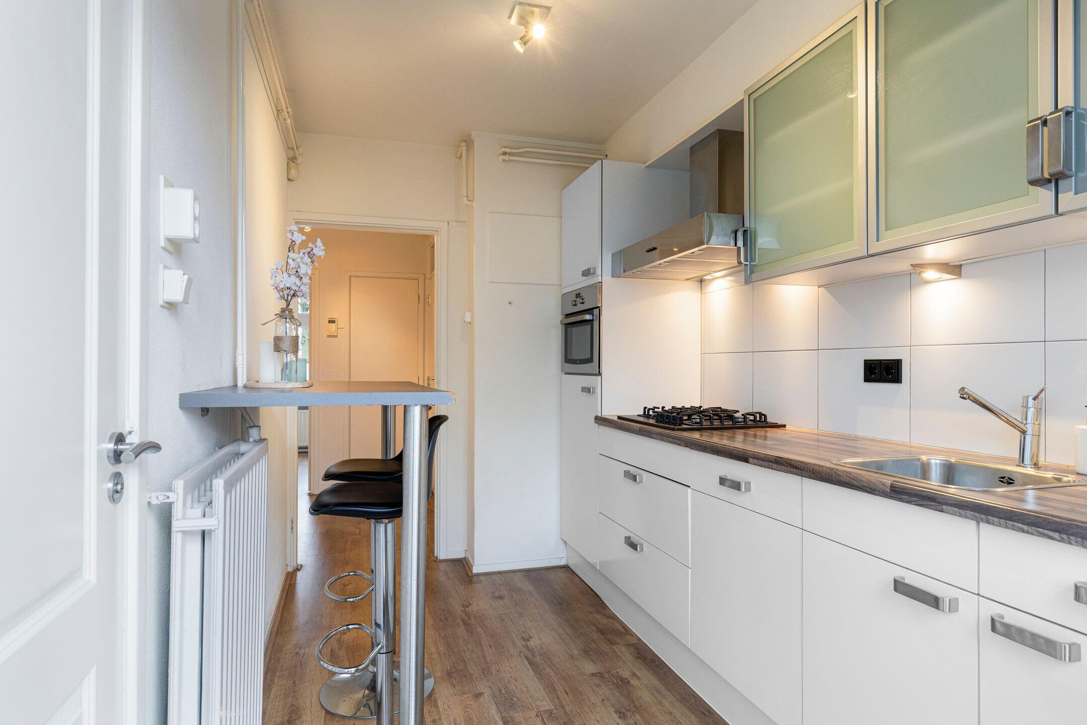 De keuken bevindt zich aan de achterzijde van het appartement, het is een mooie lichte keukenopstelling met diverse inbouwapparatuur (kookplaat/afzuigkap/koel-vriescombinatie/combimagnetron/vaatwasser), tevens is de keuken voorzien van een gezellige bartafel om heerlijk van je ontbijt te genieten.