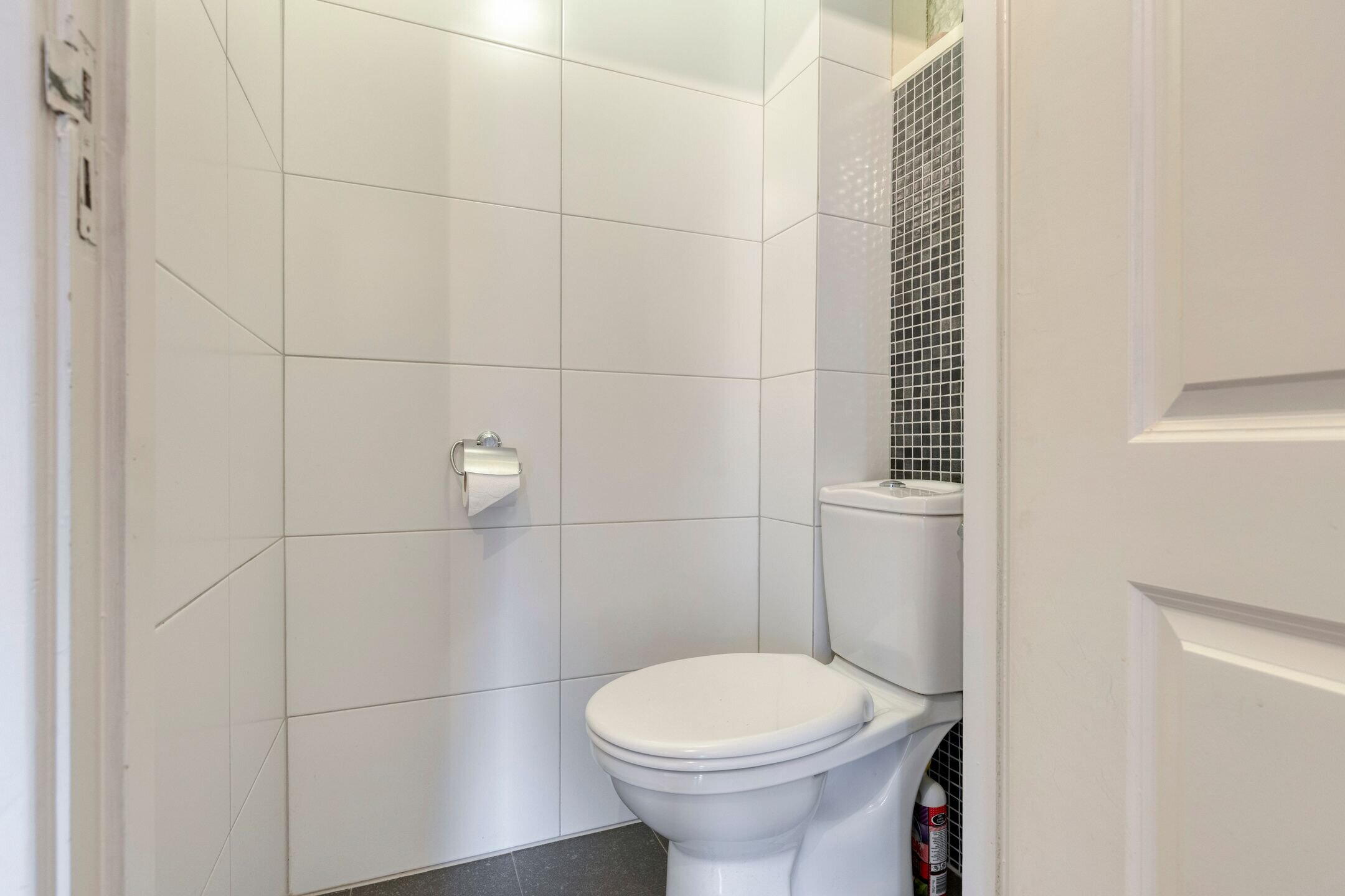 Met een paar treden ben je bij de voordeur van het appartement. Je komt binnen in de verzorgde nette hal met intercom, bergkast, meterkast en een moderne toiletruimte met fraai tegelwerk.
